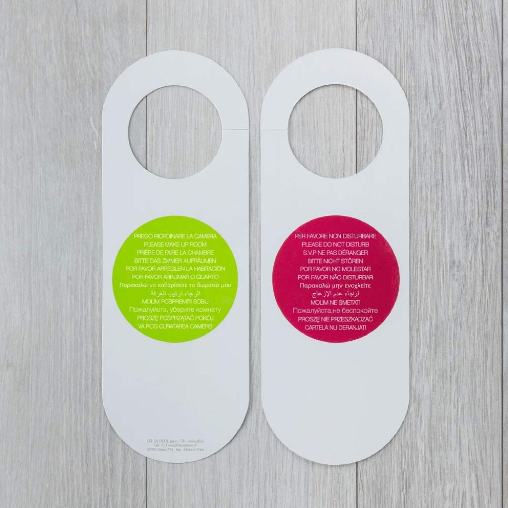 Da un lato riportano la scritta “Per favore non disturbare”, dall’altro “Prego riordinare la Camera”, entrambi disponibili in multilingua, perfetti per hotel, alberghi, B&B e affittacamere.